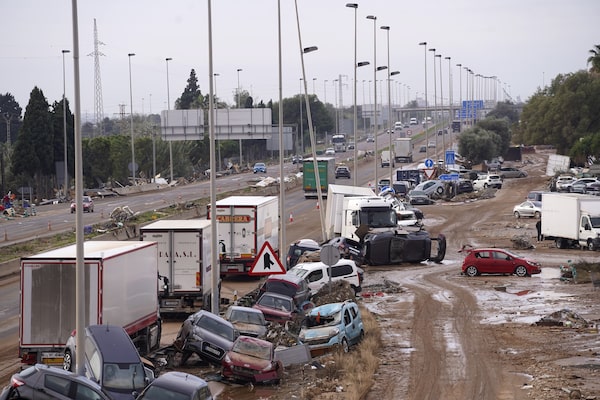 Cars are strewn on the side on a main road on Nov. 1 after floods in Valencia, Spain.Alberto Saiz/The Associated Press