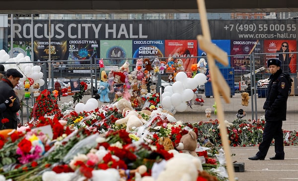 A police officer stands guard next to a makeshift memorial near the Crocus City Hall following a deadly attack on the concert venue outside Moscow on March 26.Evgenia Novozhenina/Reuters