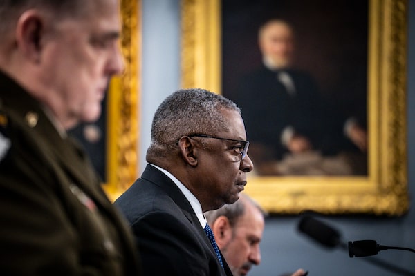 Secretary of Defense Lloyd Austin testifies during a House subcommittee hearing on Defense Appropriations on Capitol Hill, in Washington on March 23, 2023. The United States launched airstrikes in eastern Syria against militant sites linked to Iran’s Islamic Revolutionary Guards Corps after a suspected Iranian drone killed a U.S. contractor and wounded six other Americans, the Pentagon said.PETE MAROVICH