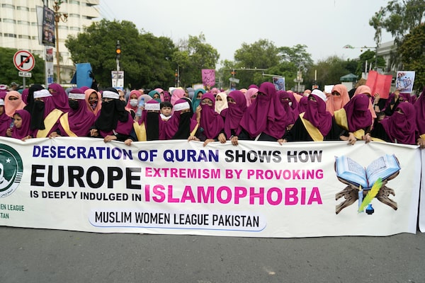 Pakistan Muslim Women League members chant slogans during a rally to denounce the recent burning of the holy book 'Quran' that took place in Sweden on July 18, in Lahore, Pakistan.K.M. Chaudary/AP Photo