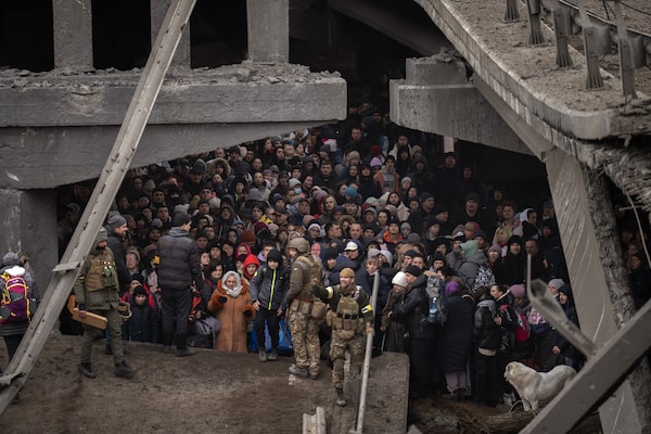 Ukrainians crowd under a destroyed bridge as they try to flee crossing the Irpin river in the outskirts of Kyiv, Ukraine, Saturday, March 5, 2022.Emilio Morenatti/The Associated Press