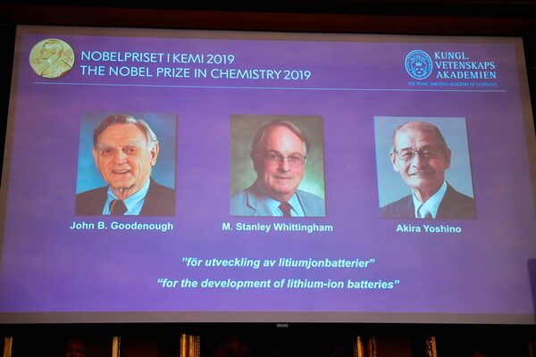 A screen displays the portraits of the laureates of the 2019 Nobel Prize in Chemistry (L-R) John Goodenough of US, Britain's Stanley Whittingham and Japan's Akira Yoshino during a press conference at the Royal Swedish Academy of Sciences in Stockholm, Sweden, on October 9, 2019. (Photo by Naina Helen JAMA / TT News Agency / AFP) / Sweden OUT (Photo by NAINA HELEN JAMA/TT News Agency/AFP via Getty Images)NAINA HELEN JAMA/AFP/Getty Images