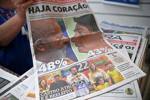 A vendor holds up the front page of a newspaper the day after the presidential elections, in Rio de Janeiro, Brazil, on Oct. 3.CARL DE SOUZA/AFP/Getty Images