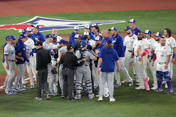 Benches clear after the Toronto Blue Jays' Andrés Giménez (0) was hit by a pitch from Los Angeles Dodgers pitcher Justin Wrobleski (70) during the fourth inning of Game 7 of hte World Series in Toronto on Saturday.Chris Young/The Canadian Press