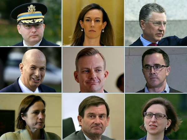 Some of the key figures in the impeachment proceedings so far. Top row: Alexander Vindman, National Security Council director for European Affairs; Jennifer Williams, aide to U.S. Vice-President Mike Pence; Kurt Volker, U.S. ambassador to NATO and U.S. special envoy for Ukraine. Middle row: Gordon Sondland, U.S. Ambassador to the European Union; David Holmes, a State Department official; Tim Morrison, top Russia and Europe adviser on the National Security Council Tim Morrison. Bottom row: Fiona Hill, former deputy assistant to the President; David Hale, U.S. under-secretary of state for political affairs David Hale; and Laura Cooper, deputy assistant secretary of Defense for Russia, Ukraine, and Eurasia.MANDEL NGAN/AFP/Getty Images