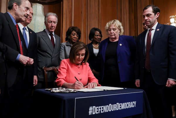 Washington, Jan. 15: U.S. House Speaker Nancy Pelosi is surrounded by the House impeachment managers and committee chairs as she signs the two articles of impeachment against U.S. President Donald Trump before sending them over to the Senate.Leah Millis/Reuters/Reuters
