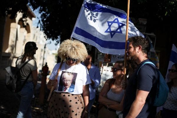 A mourner wearing a shirt with an image of U.S. President Donald Trump holds an Israeli flag at the funeral procession for Guy Illouz, whose body was returned to Israel as part of the ceasefire deal, in Rishon Le'zion, Israel, on Oct. 15.Stoyan Nenov/Reuters