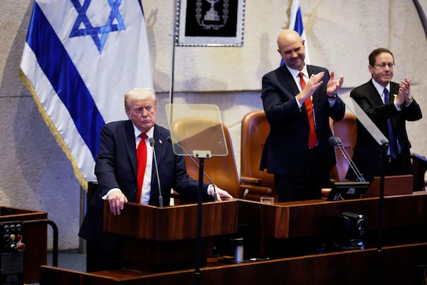 U.S. President Donald Trump, next to Amir Ohana, Speaker of the Israeli Knesset and Israeli President Isaac Herzog, addresses the Knesset, Israel's parliament, on Oct. 13, in Jerusalem.Chip Somodevilla/The Associated Press