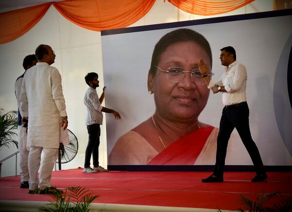 Workers put up a giant hoarding of Droupadi Murmu for her felicitation, before she was announced as India's new president, in New Delhi, on July 21.Manish Swarup/The Associated Press