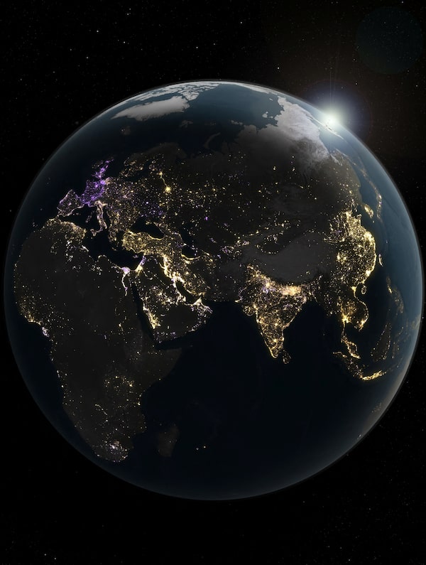 A nighttime view of Earth, derived from satellite images taken daily over the past decade, capturing human activity on the planet through the emissions of artificial light.Michala Garrison/NASA Earth Observatory/via Reuters