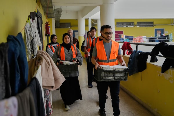 Volunteers carry meals for displaced people fleeing Israeli strikes at a school-turned-shelter in Sidon, Lebanon on Saturday.Mohammed Zaatari/The Associated Press