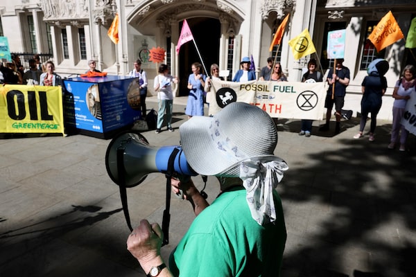 A person uses a megaphone as climate activists await a ruling on whether planning permission granted for oil wells in southern England was lawful, outside the Supreme Court in London, on June 20.Kevin Coombs/Reuters
