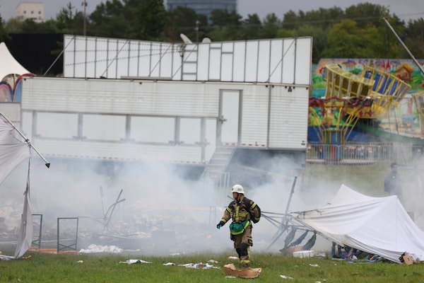 A firefighter walks through smoke at the 'Eritrea Scandinavia' festival in Stockholm this past August, where some booths were set on fire.Magnus Lejhall/TT News Agency via AP