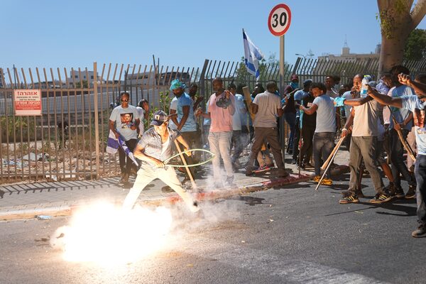 A stun grenade from Israeli police explodes next to Eritrean protesters in Tel Aviv on Sept. 2, 2023.Ohad Zwigenberg/The Associated Press