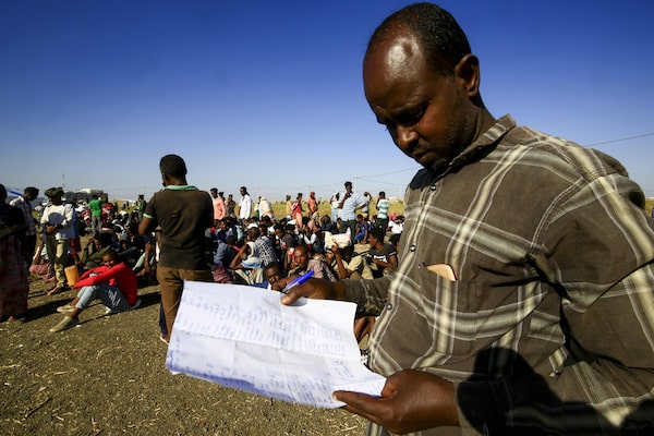 A man registers Ethiopian refugees, who fled the fighting in Tigray Region, at a border reception centre (Village 8) in Gedaref State, eastern Sudan, on Nov. 29, 2020.ASHRAF SHAZLY/AFP/Getty Images