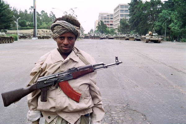 A rebel with the EPRDF stands armed in front of the presidential palace in Addis Ababa in 1991.JEROME DELAY/AFP via Getty Images
