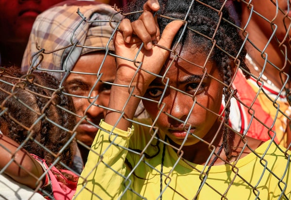Ethiopian refugees look out from behind a fence at a border-reception centre in Sudan's eastern Gedaref State on Nov. 20.ASHRAF SHAZLY/AFP via Getty Images