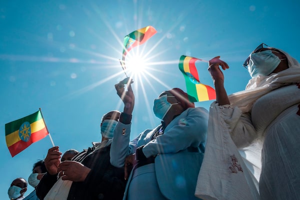 Staff at the Ethiopian prime minister's office in Addis Ababa hold flags at a Nov. 17 event to honour the national defence forces.EDUARDO SOTERAS/AFP via Getty Images