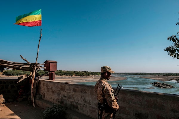 A member of the Amhara Special Forces watches the border with Eritrea in Humera on Nov. 22.EDUARDO SOTERAS/AFP via Getty Images