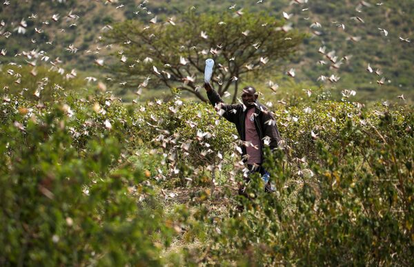 Ahmed Ibrahim, an Ethiopian farmer, attempts to fend off desert locusts as they fly in his khat farm on the outskirts of Jijiga, Ethiopia, on Jan. 12, 2020.GIULIA PARAVICINI/Reuters
