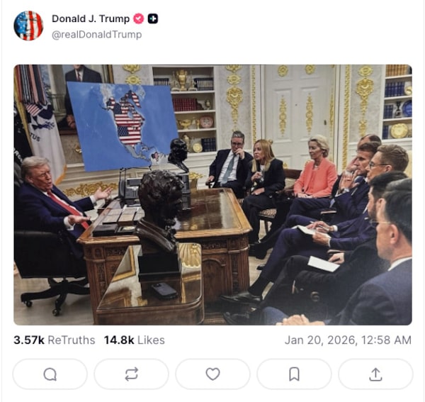 On Tuesday, as he prepared to head to the World Economic Forum, Mr. Trump posted a photo of himself sitting in the Oval Office talking to European leaders that had been altered to show a map of the Western Hemisphere with American flags covering not only the United States but also Greenland, Canada, Cuba and Venezuela.