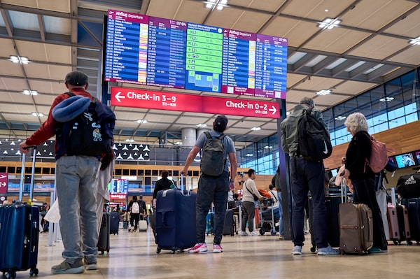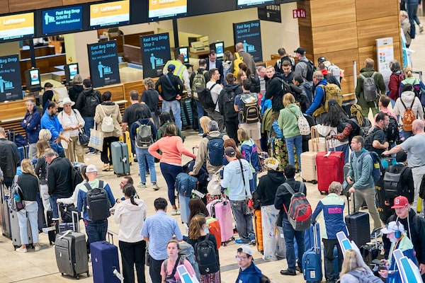 Passengers at Berlin Brandenburg Airport on Monday, after hackers knocked out automatic check-in systems provided by Collins Aerospace over the weekend.Michael Ukas/The Associated Press