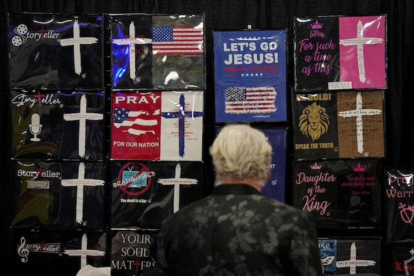 Vendors sell T-shirts this past Feb. 22 in Nashville, where Donald Trump came to speak at the National Religious Broadcasters Association International Christian Media Convention.Seth Herald/Reuters