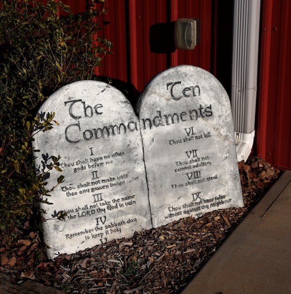 Tablets with the Ten Commandments sit outside a church in Piedmont, S.C., near a polling station in Feb. 3's Democratic presidential primary.Shannon Stapleton/Reuters