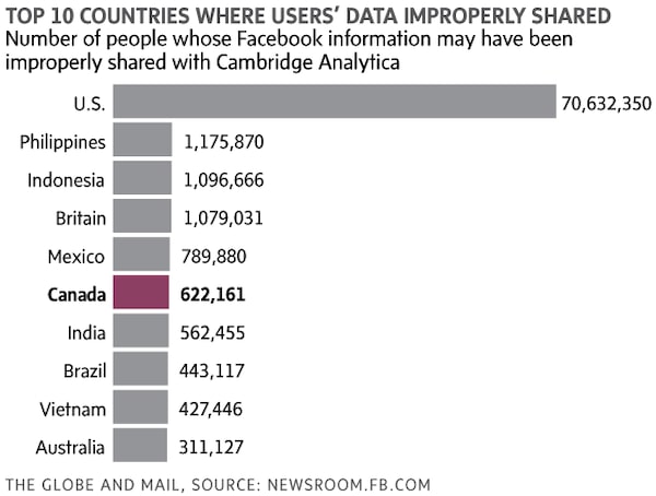More than 622,000 Canadian Facebook users − and 87 million people across the globe − may have had their personal information improperly shared with a U.K.-based political consulting firm, the social-media giant said on Wednesday.
