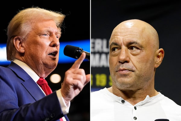 Combination image of Donald Trump, left, on Oct. 26, and Joe Rogan on Aug. 18, 2023.The Associated Press
