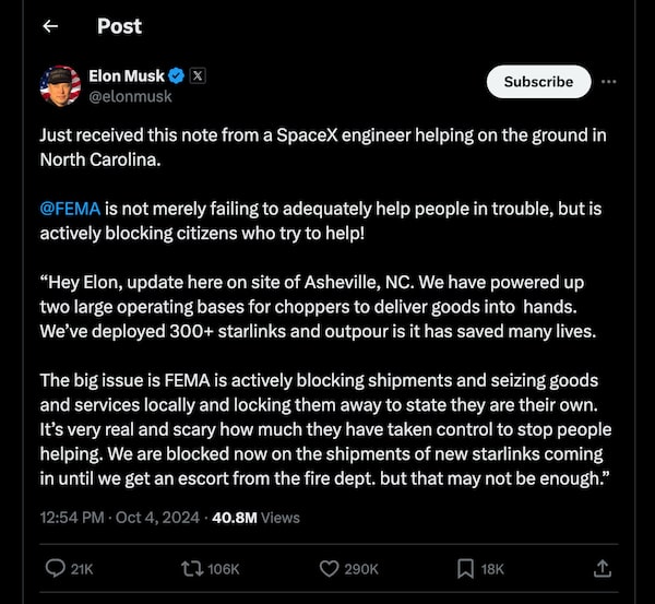 In a post to X on Oct. 4 citing an unnamed SpaceX employee, Elon Musk amplified the debunked claim that FEMA is confiscating aid civilians are attempting to distribute.