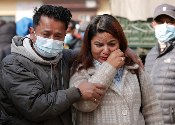 Family members mourn the death of a Yeti Airlines plane crash victim in Pokhara, Nepal, on Jan. 17.STRINGER/Reuters