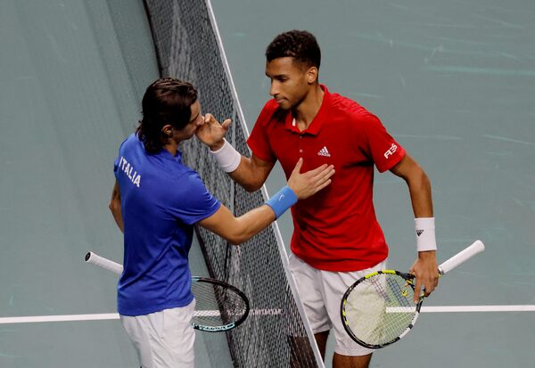 Canada’s Felix Auger-Aliassime sent over a dozen aces as he beat Lorenzo Musetti 6-3 6-4 to level their Davis Cup semi-final tie with Italy at 1-1 on Saturday after Lorenzo Sonego overcame Denis Shapovalov 7-6(4) 6-7(5) 6-4 in a marathon encounter.