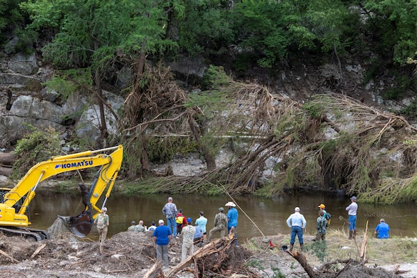 Members of a search and rescue team look for missing people amid debris in the waters of the Guadalupe River.Umit Bektas/Reuters