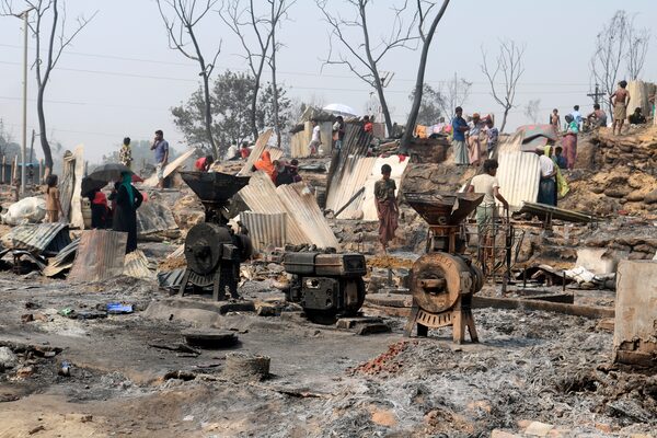 Rohingya refugees sift through the remains of a fire at a camp in Balukhali, Bangladesh, on March 23, 2021.Shafiqur Rahman/The Associated Press