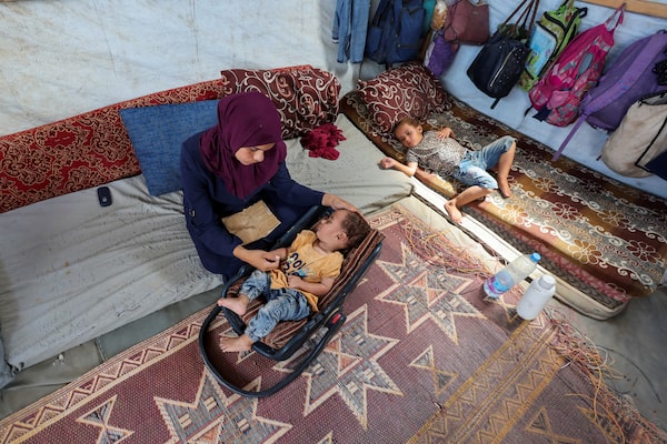 The mother of Palestinian boy Abdul Rahman Abu Al-Jidyan, who is the first person to contract polio in Gaza in 25 years, looks after him in their tent, in Deir Al-Balah, in the central Gaza Strip, on Aug. 28.Ramadan Abed/Reuters