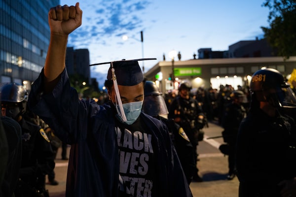 Louis Michael, 22, raises his fist in solidarity during a protest in honour of George Floyd. Michael wears his graduation cap and gown after receiving his bachelors degree in communications from MidAmerica Nazarene University in Kansas.Sarabeth Maney/The Globe and Mail