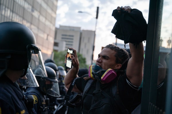 A demonstrator shouts at officers while holding up a cellphone photo of George Floyd in Oakland. 'This is George Floyd!' he shouts, 'Do you see him?'Sarabeth Maney/The Globe and Mail