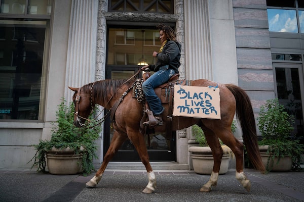 Brianna Noble, 25, rides her horse Dapper Dan through the streets of downtown Oakland. 'There is no image bigger than a black woman on a large horse,' she says. 'This is the image we would like to see portrayed in our community.'Sarabeth Maney/The Globe and Mail