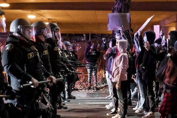 A protester comes face-to-face with a line of police at a blocked-off street away from the main protests in Oakland.Erik Saevi/The Globe and Mail