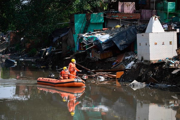 National Disaster Response Force personnel inspect the area where houses collapsed into a canal due to heavy early morning rains, in New Delhi, India, on July 19, 2020.SAJJAD HUSSAIN/AFP/Getty Images