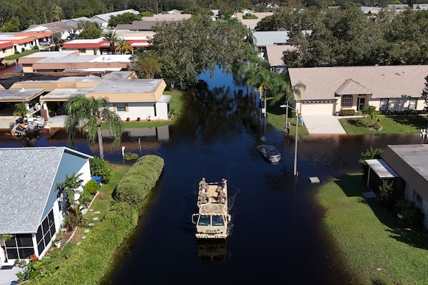 A truck from the Florida National Guard goes out to help residents trapped in their homes as waters rise after Hurricane Milton caused the Anclote River to flood in New Port Richey, Fla., on Oct. 11.Mike Carlson/The Associated Press