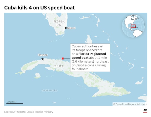 The speedboat was roughly 1.6 kilometres northeast of Cayo Falcones, off Cuba’s north coast, Cuba’s Interior Ministry says.Kevin S. Vineys/The Canadian Press