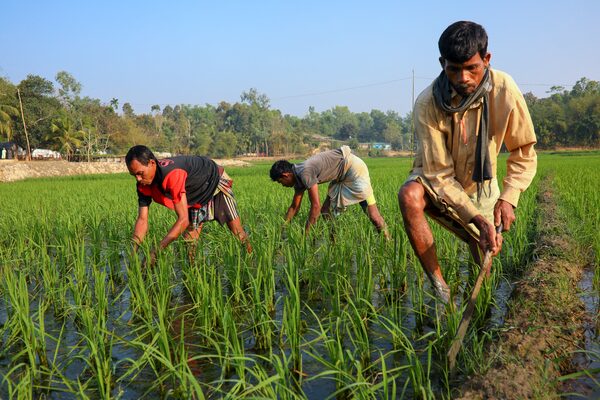 Abul Boshor, left, and Muhammad Harun, centre, two Rohingya refugee men, remove weeds from a paddy field alongside a Bangladeshi worker.MOHAMMAD PONIR HOSSAIN/The Globe and Mail