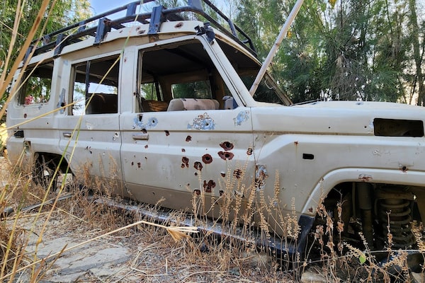 A bullet-riddled vehicle sits abandoned on the grounds of Wukro Lodge, once occupied by Eritrean troops, in the Tigray region of northern Ethiopia.Jody Ray/The Associated Press