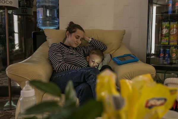 Maria Oliynukov and her two-year-old son, Andrej, spend the night in the lobby of the Hotel Marko.