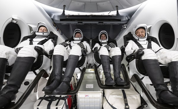From left: Roscosmos cosmonaut Konstantin Borisov, ESA (European Space Agency) astronaut Andreas Mogensen, NASA astronaut Jasmin Moghbeli and Japan Aerospace Exploration Agency (JAXA) astronaut Satoshi Furukawa inside the SpaceX Dragon Endeavour spacecraft onboard the SpaceX recovery ship MEGAN shortly after having landed in the Gulf of Mexico off the coast of Pensacola, Florida, Tuesday, March 12, in this photo provided by NASA.Joel Kowsky/The Associated Press