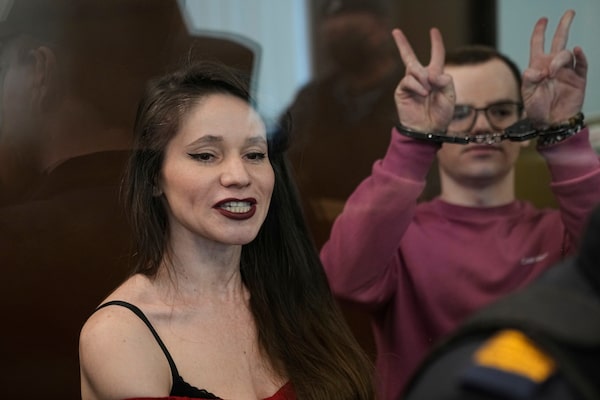 Russian journalists, Antonina Favorskaya, left, and Artyom Kriger, accused of working for a group founded by the late Russian opposition politician Alexey Navalny, stand in a defendant's cage of the Nagatinsky District Court in Moscow, Russia, on April 15.The Canadian Press