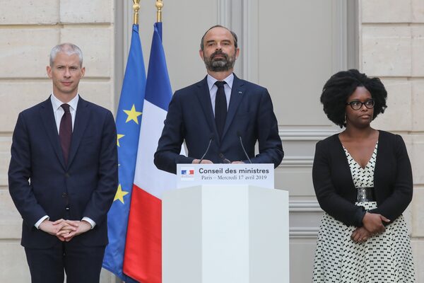 French Culture Minister Franck Riester, left, Prime Minister Edouard Philippe and French Junior Minister and Government's spokesperson Sibeth Ndiaye, right, shown during a press conference after the weekly cabinet meeting, dominated by the aftermath of the Notre-Dame cathedral fire, at the Elysee Presidential palace on April 17, 2019 in Paris.LUDOVIC MARIN/AFP/Getty Images