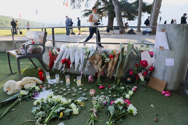 A general view of flowers and candles left at the Le Paquier park after several children and adults were injured in a knife attack, near the lake in Annecy, in the French Alps, France, June 9, 2023.DENIS BALIBOUSE/Reuters